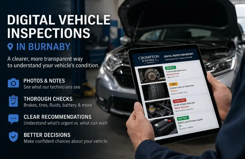 At Crompton Brothers Automotive, digital inspections help Burnaby drivers better understand their vehicles and make more confident decisions about repairs and maintenance. To learn more about how this process works, visit our Digital Vehicle Inspections in Burnaby page.